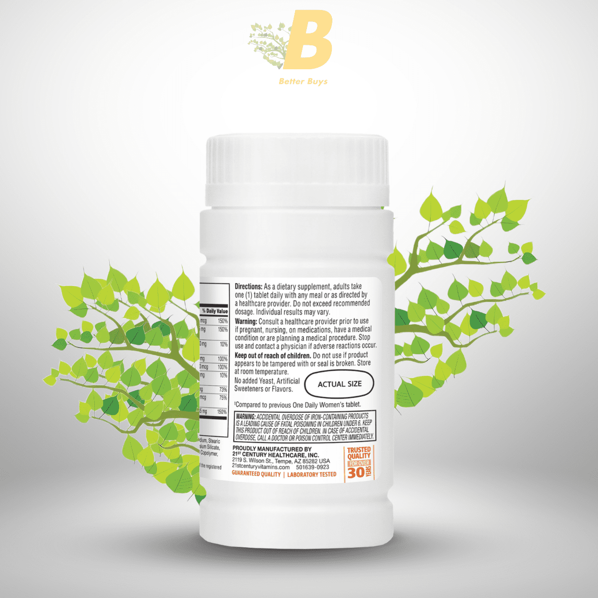 21st Century One Daily Women’s Tablets works by delivering a balanced multivitamin that supports over 25 essential processes. Folic acid (400mcg) aids DNA synthesis for cell growth, while iron (18mg) forms hemoglobin for oxygen delivery. Calcium (200mg) and vitamin D (10mcg) promote bone mineralization, and B-vitamins like B-6 support hormone regulation for mood. Vitamin C (60mg) boosts collagen for skin health, and zinc (8mg) enhances immunity. The tablet form ensures steady absorption, with effects in 4-8 weeks.