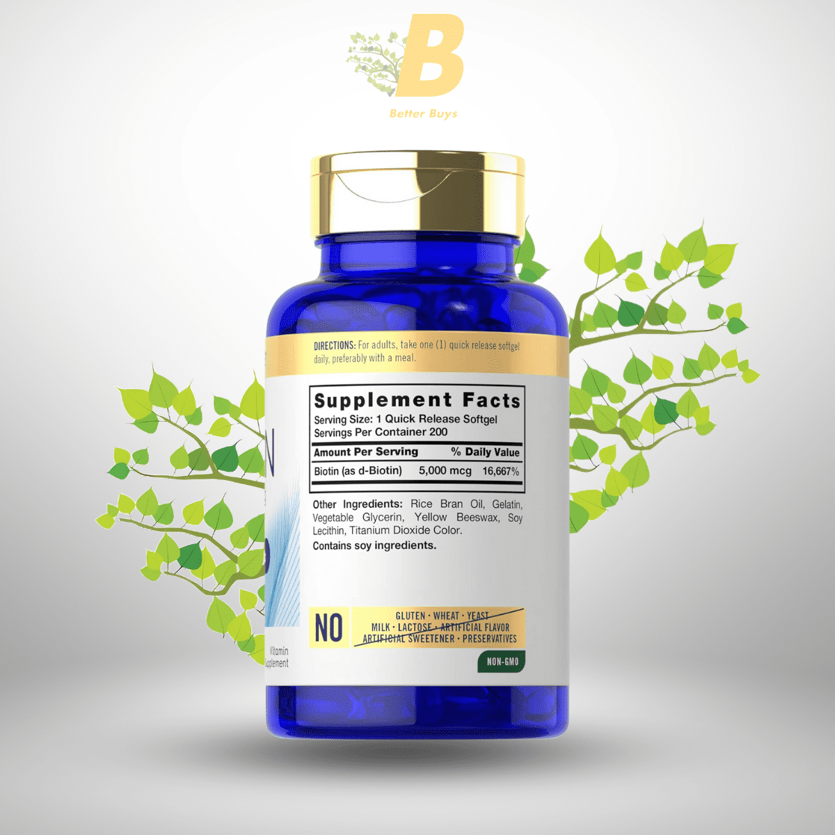 Carlyle Biotin 5000mcg Softgels offer an advanced beauty formula designed to support healthy hair, radiant skin, and strong nails. Known as the “beauty nutrient,” Biotin (Vitamin B7) plays a crucial role in the body’s keratin infrastructure, which is essential for maintaining the health of hair follicles, skin tissues, and nail strength. Each softgel delivers a high-potency 5000 mcg dose of Biotin, formulated for rapid absorption through convenient quick release softgels.
