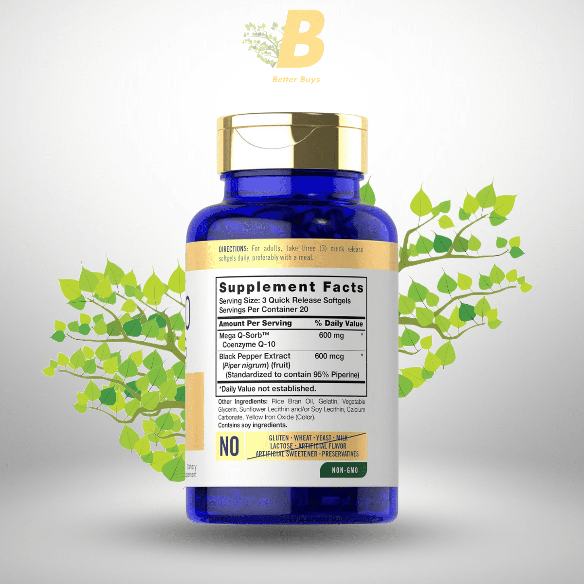Mega Q-Sorb Coenzyme Q-10 (600 mg per softgel, as ubidecarenone): Supports heart and energy, daily value not established.
