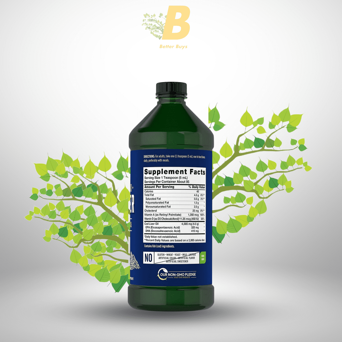 - Cod Liver Oil (4,585 mg per teaspoon): Provides 1,000 mg Omega-3 (600 mg EPA, 400 mg DHA), vitamins A (1,500 mcg RAE/5,000 IU), D3 (10 mcg/400 IU), daily value not established.