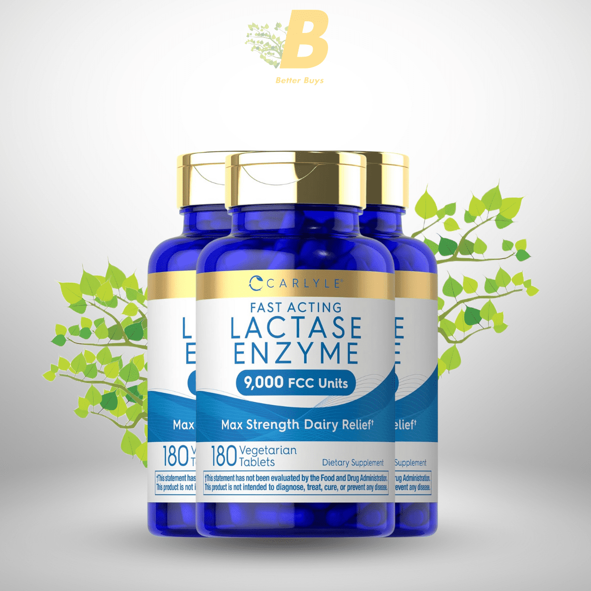 Carlyle Lactase Enzyme Pills 9000 FCC | 180 Tablets | Fast Acting Dairy Relief Supplement | Max Strength Support | Non-GMO, Gluten Free