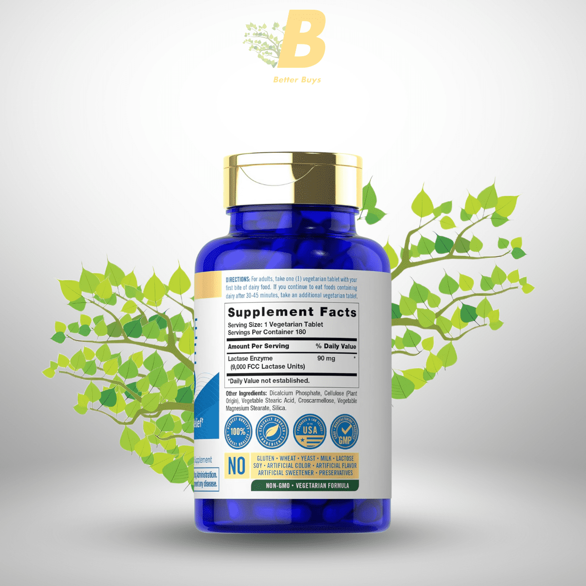 Lactase Enzyme (9,000 FCC Lactase Units per tablet, from Aspergillus oryzae): Breaks down lactose for digestion, daily value not established.