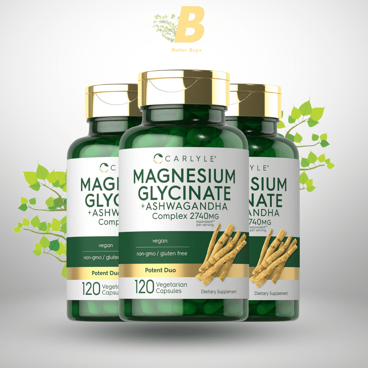 Carlyle Magnesium Glycinate with Ashwagandha | 2,740mg Complex | 120 Vegetarian Capsules | Potent Duo | Non-GMO and Gluten Free Supplement
