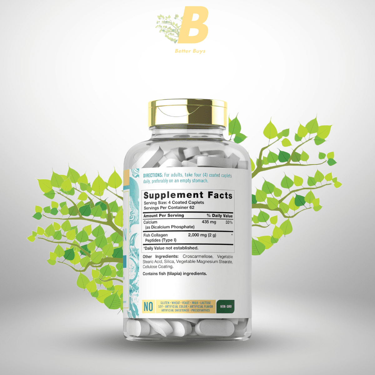 Hydrolyzed Fish Collagen Peptides (2,000 mg per 4 caplets, Type I): Supports skin, joints, and bones, daily value not established.