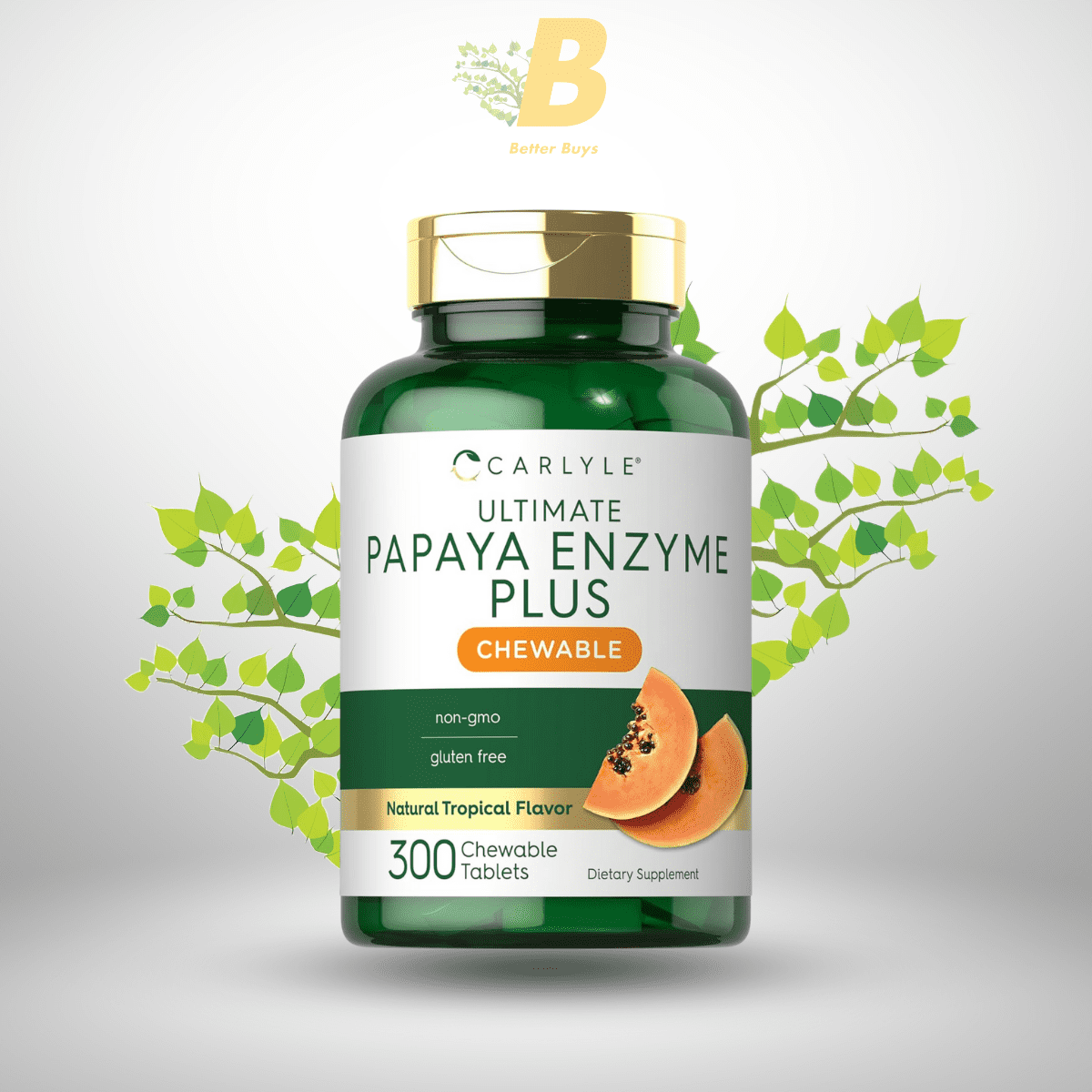 Carlyle Papaya Enzyme Chewable Tablets | 300 Count | Tropical Flavor | Digestive Enzyme Complex | Non-GMO & Vegetarian Supplement