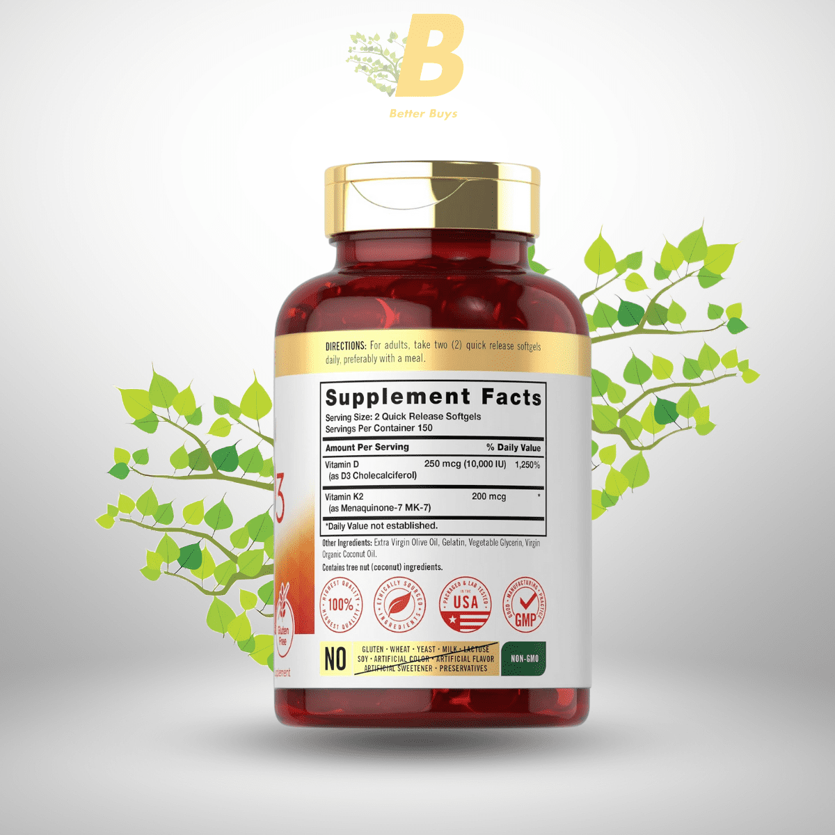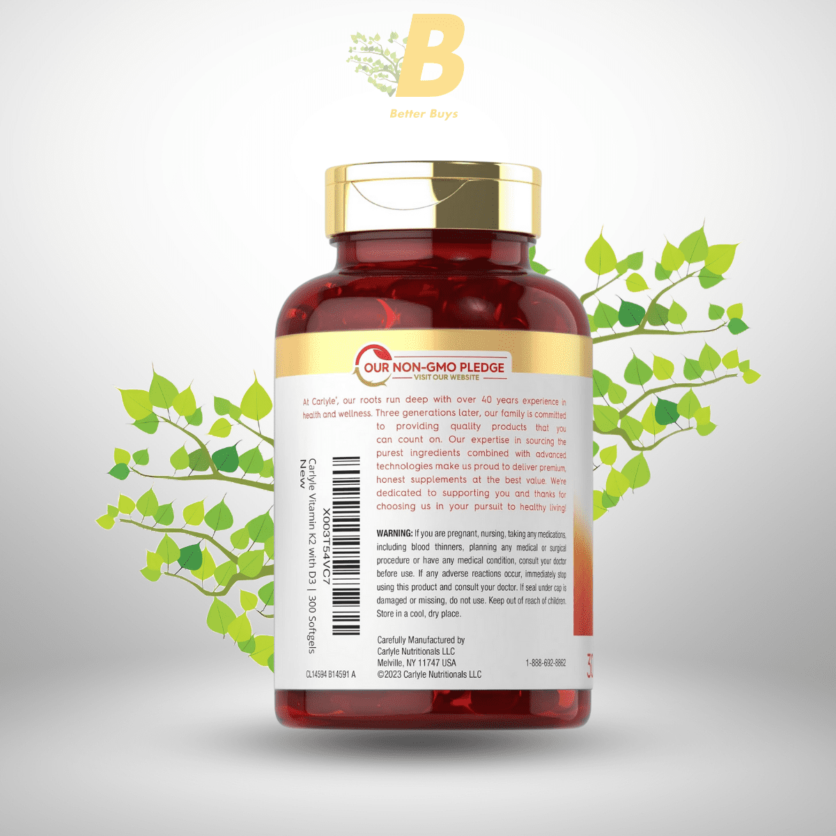 Carlyle Vitamin K2 + D3 Supplement | 300 Softgels | 200mcg MK-7 & 10,000 IU D3 | Non-GMO Bone & Heart Health Supplement
