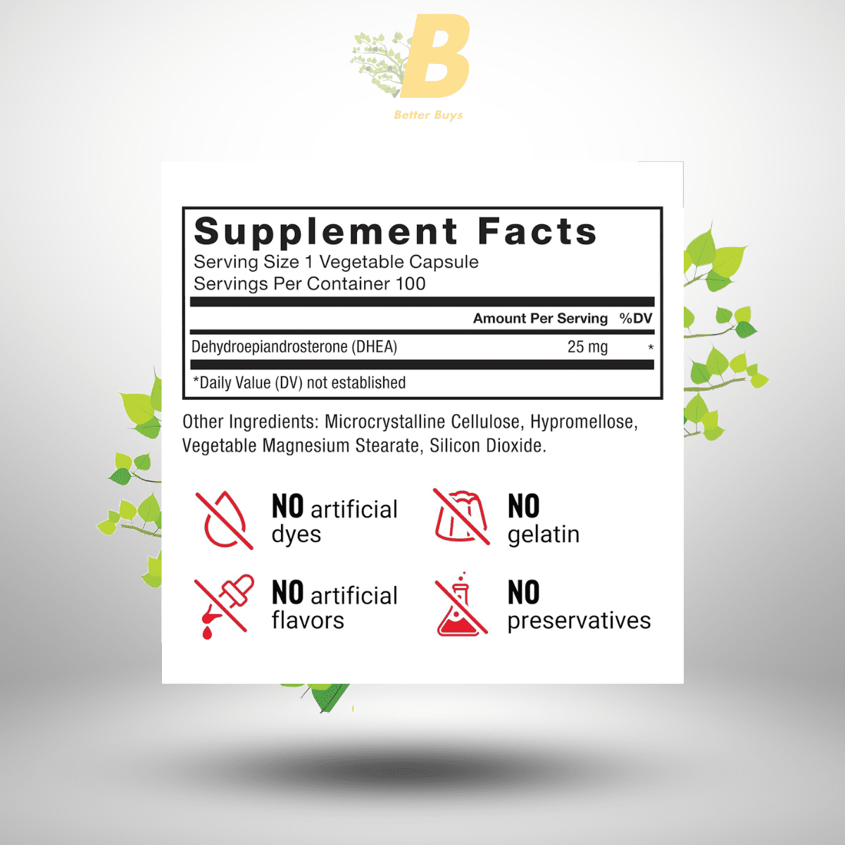 DHEA (Dehydroepiandrosterone): The active ingredient in this supplement, DHEA helps regulate hormone balance and supports mood, energy, and overall health. Each capsule provides a potent 25mg dose of DHEA.