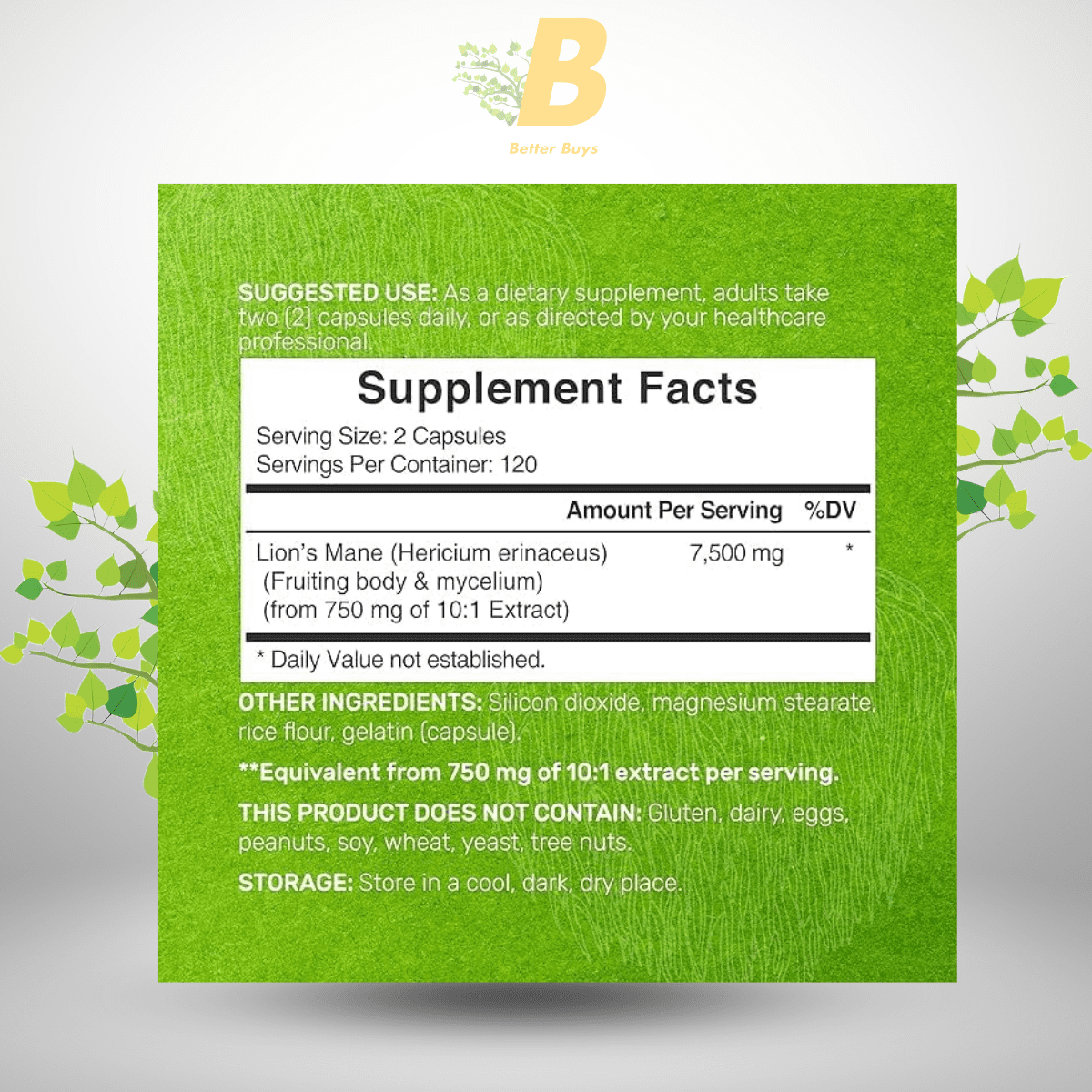 | Lions Mane Mushroom Extract | 7,500mg (10:1 Concentration) |