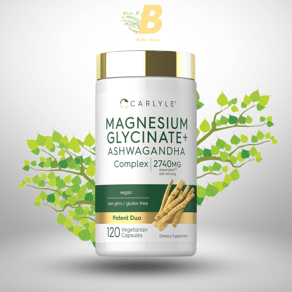 Carlyle Magnesium Glycinate with Ashwagandha | 2,740mg Complex | 120 Vegetarian Capsules | Potent Duo | Non-GMO and Gluten Free Supplement