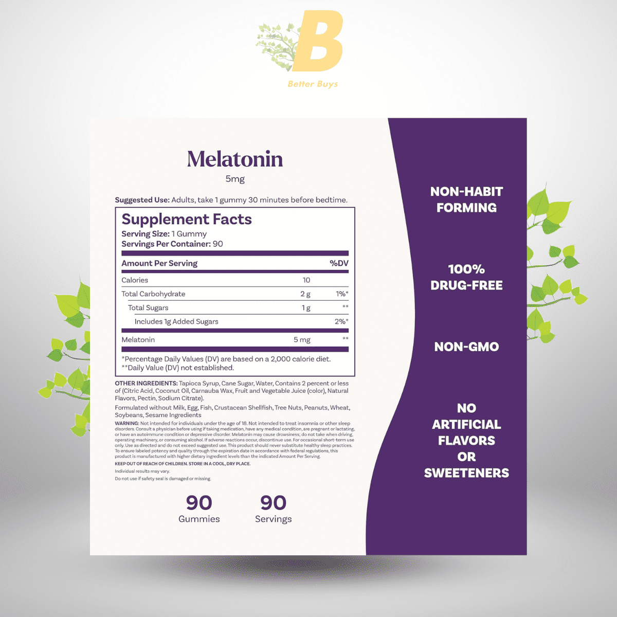 Melatonin (5 mg per 2 gummies): Supports sleep onset and duration, daily value not established.