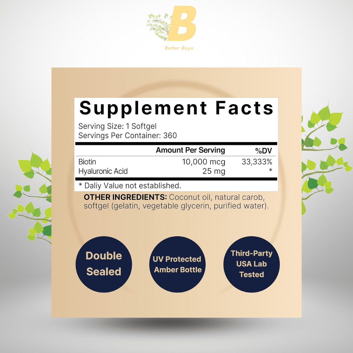 - Key Actives: Biotin 10,000 mcg + Hyaluronic Acid 25 mg