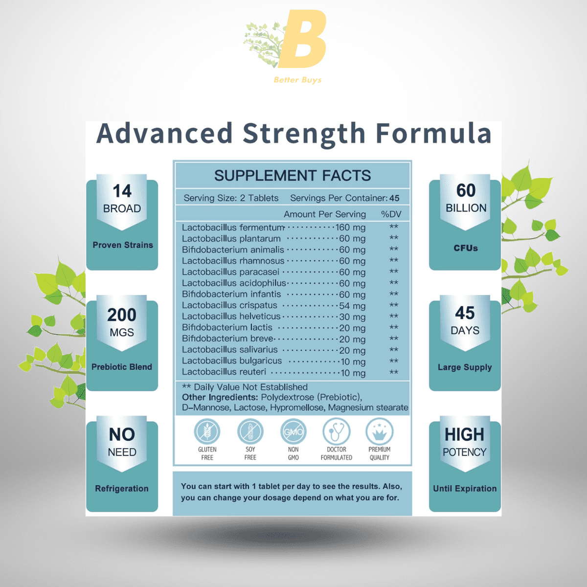 Probiotic Strains: Includes 14 scientifically studied strains such as Lactobacillus acidophilus, Bifidobacterium bifidum, Lactobacillus rhamnosus, and Saccharomyces boulardii.