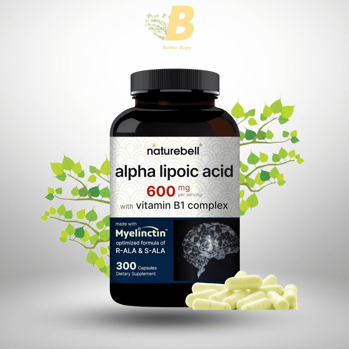 NatureBell Alpha Lipoic Acid 600mg with B1 Complex is a powerful antioxidant supplement that contains a unique Myelinctin formula, which combines two forms of Alpha Lipoic Acid (R-ALA and S-ALA) along with Thiamine Mononitrate and Benfotiamine. This 4-in-1 formula enhances bioavailability, ensuring that your body absorbs and utilizes the nutrients effectively.