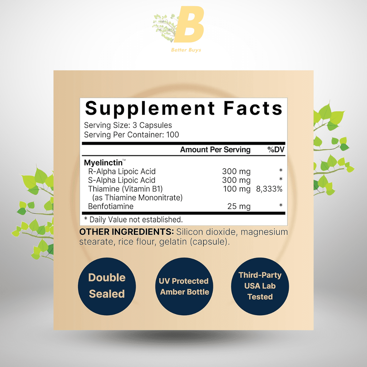 The Myelinctin formula in NatureBell Alpha Lipoic Acid combines two forms of ALA (R-ALA and S-ALA) for maximum antioxidant effect. R-ALA is considered the more bioavailable form, meaning your body absorbs it more efficiently, while S-ALA has additional antioxidant properties. The addition of Thiamine (Vitamin B1) and Benfotiamine helps support energy metabolism and nerve health, ensuring the supplement works holistically.