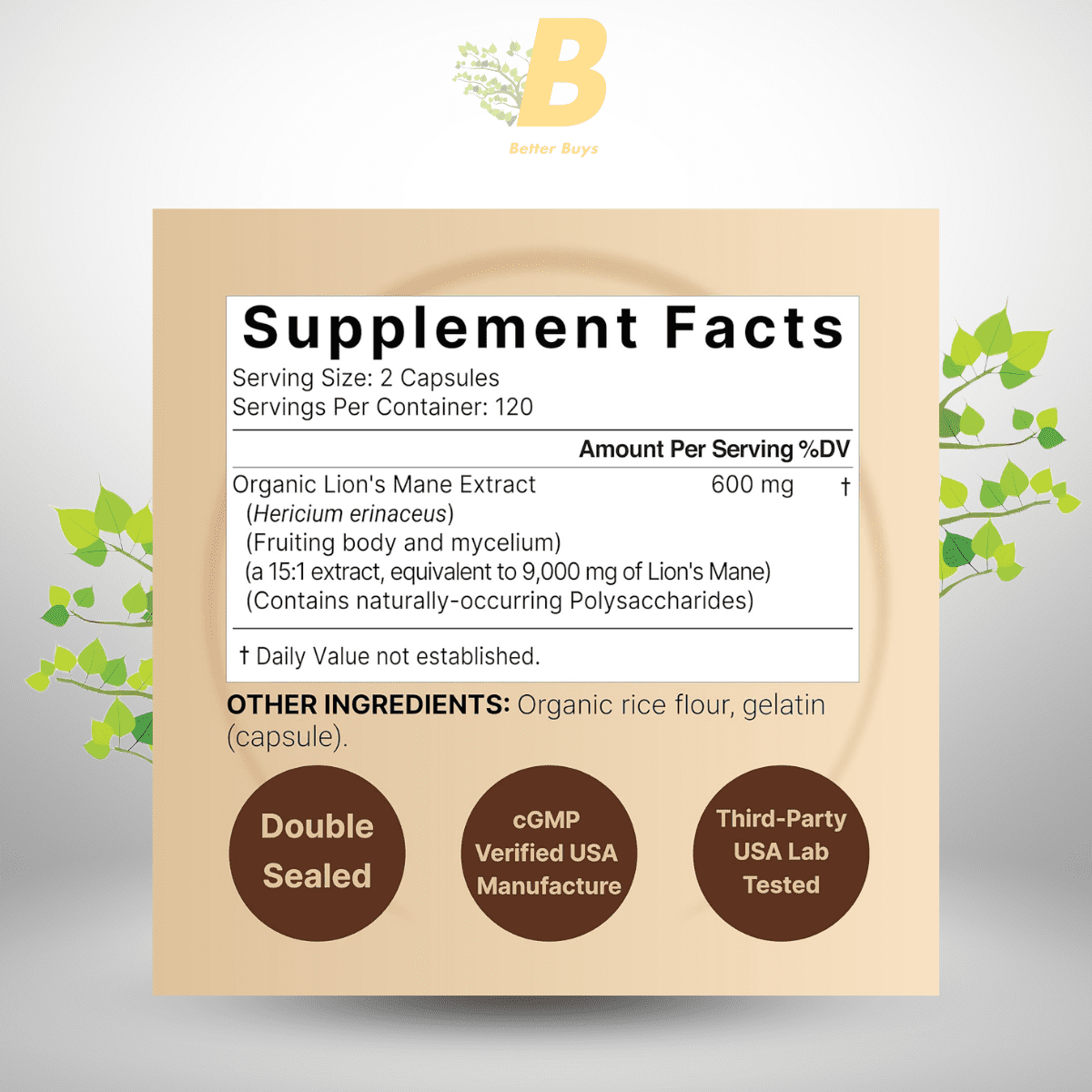 Each serving (2 capsules) delivers 9,000mg of organic Lion’s Mane mushroom, ensuring you get a potent dose of the beneficial compounds that support cognitive and immune health.
