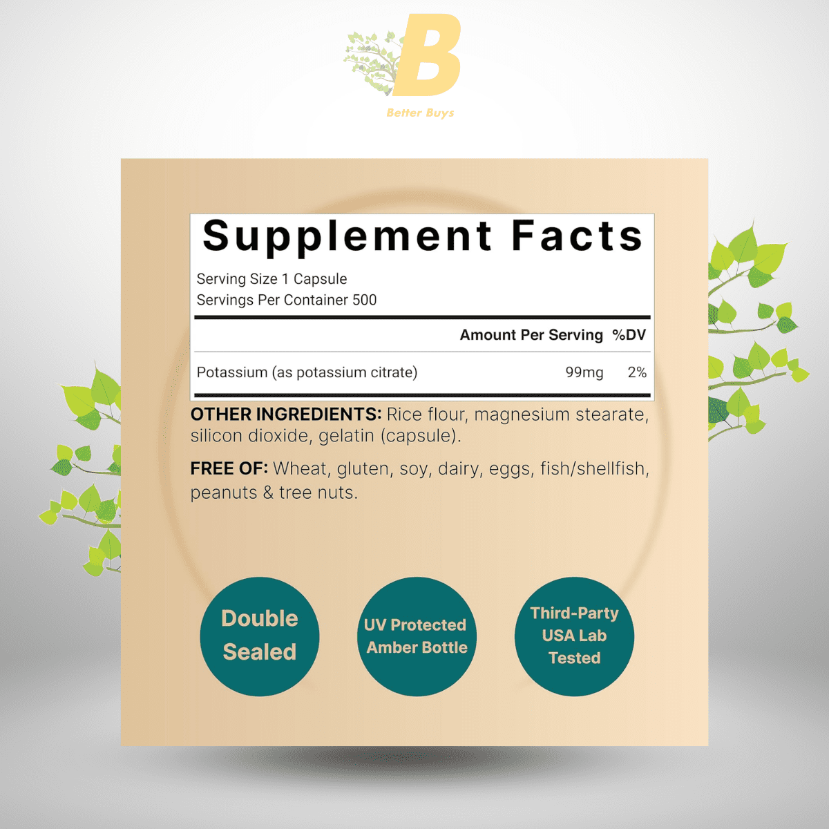 Each bottle contains 500 capsules, providing a one-year supply when taken daily at the recommended serving size of one capsule. The 99mg of elemental potassium per capsule ensures that you get a sufficient dose to support heart, muscle, and bone health.