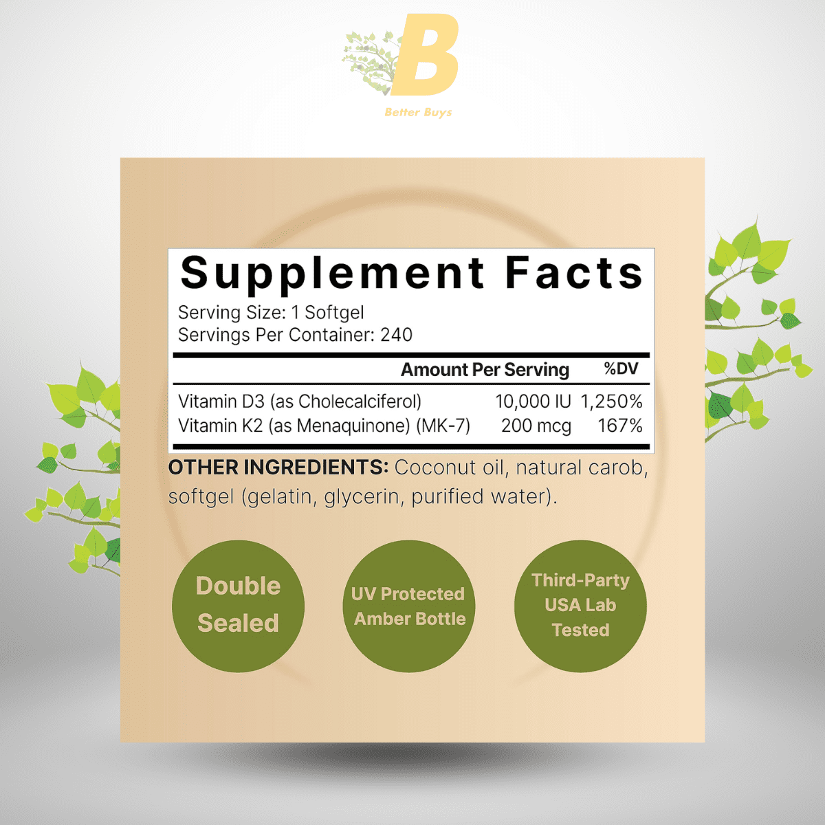 NatureBell combines the powerful benefits of 10,000 IU Vitamin D3 and 200 mcg Vitamin K2 MK-7, enhanced with Virgin Coconut Oil for optimal absorption. This combination provides complete support for bone, heart, and immune health.