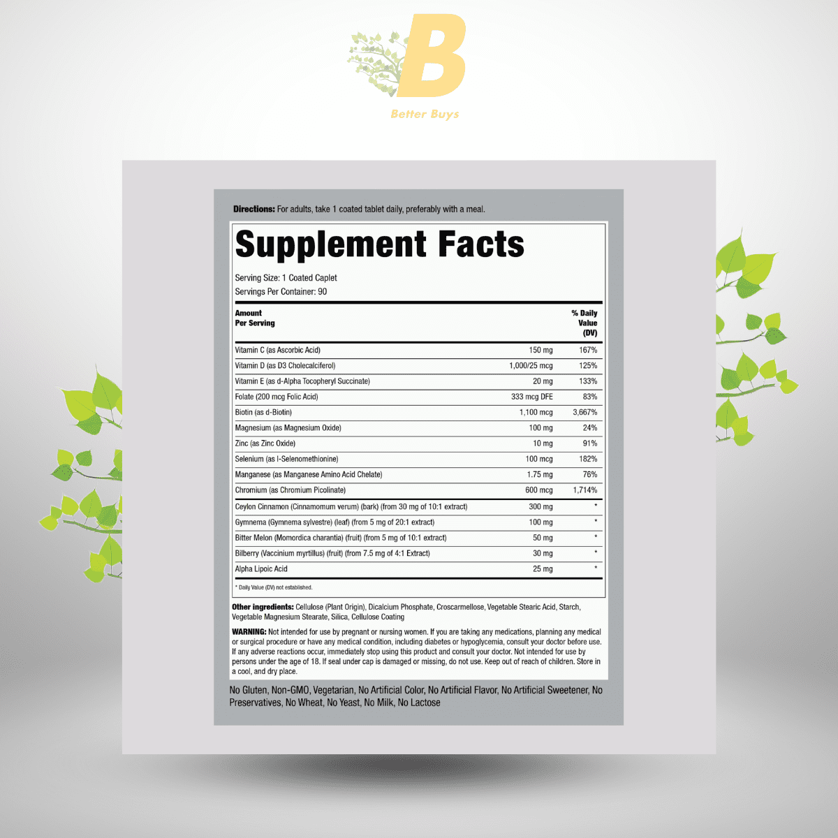 Herbal Extracts: Alpha Lipoic Acid (100 mg) for neuropathy, Bitter Melon (100 mg), Gymnema Sylvestre (100 mg), Fenugreek (100 mg), Cinnamon (100 mg), Banaba (50 mg) for traditional blood sugar support.