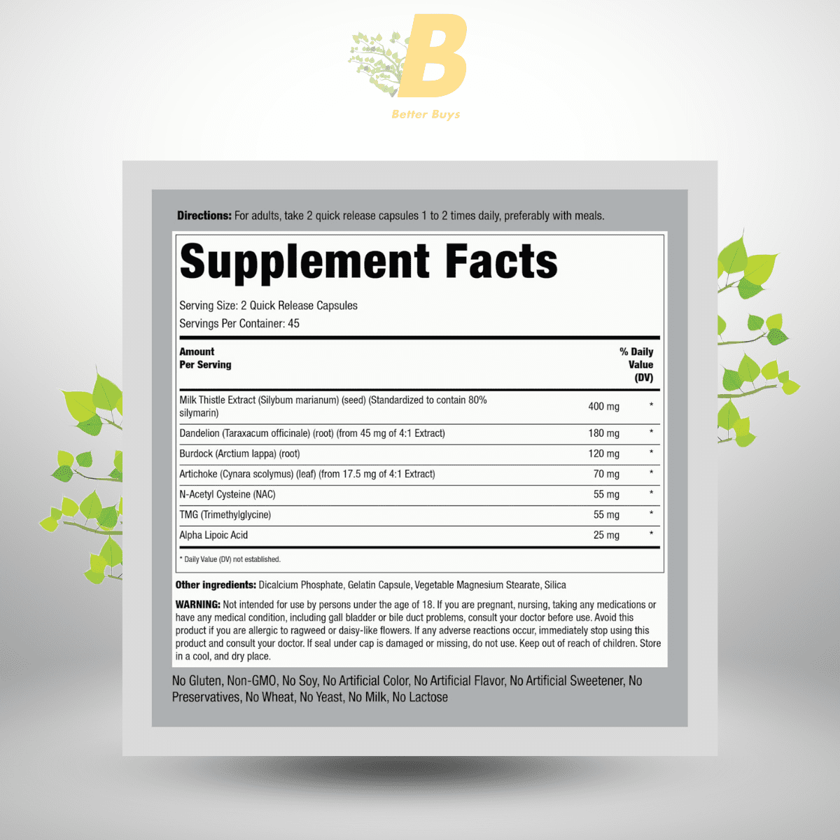 Dandelion Root (100 mg): From Taraxacum officinale, it promotes bile production and digestive health, acting as a natural diuretic.