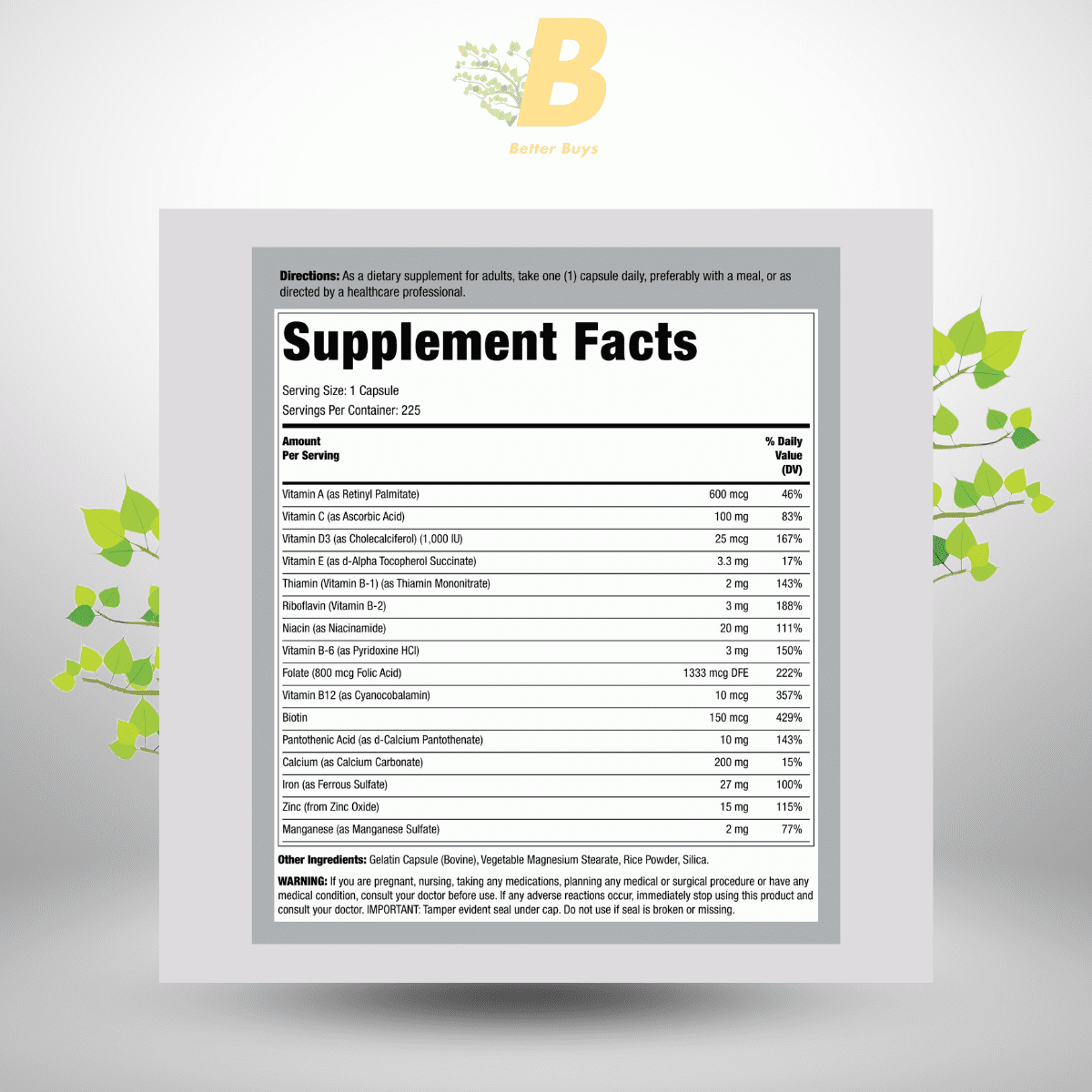 Iron (27 mg as Ferrous Fumarate): Gentle on the stomach, this chelated form supports hemoglobin production without common gastrointestinal side effects.