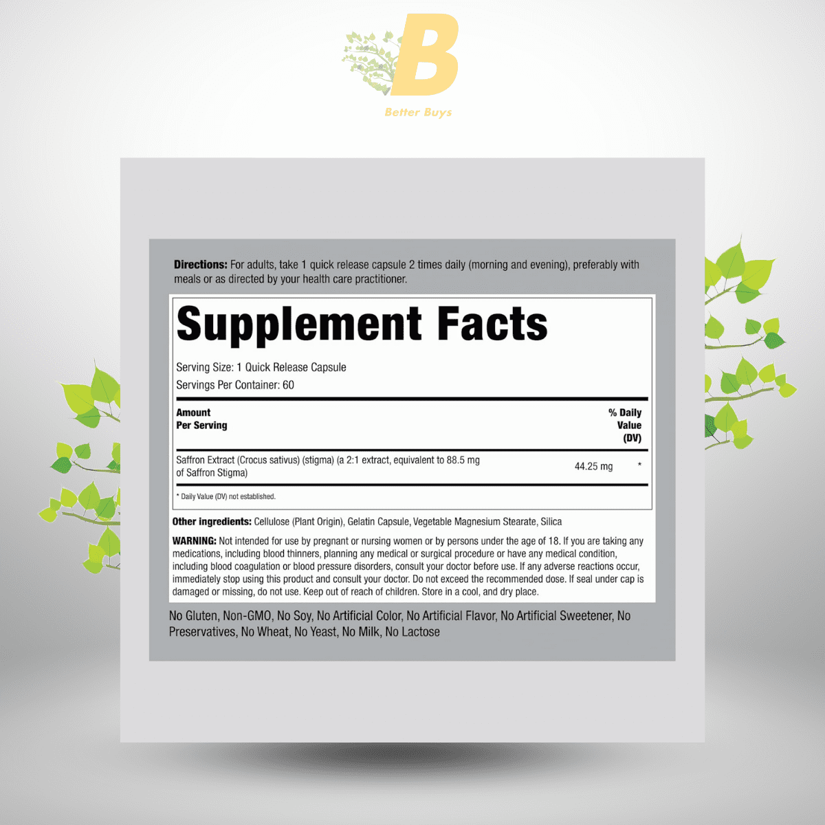 High-quality saffron extract in convenient capsule form. Non-GMO and gluten-free.