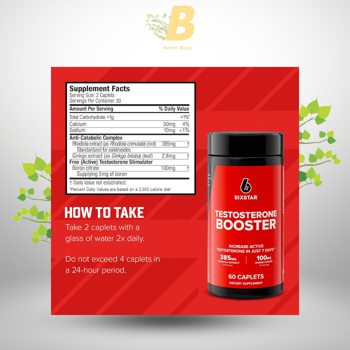 Take 2 caplets of Six Star Testosterone Booster daily with a meal and water for best absorption. This provides the full serving for hormone support. Use consistently for 7 days to see initial boosts, continuing for ongoing benefits. Store in a cool, dry place.