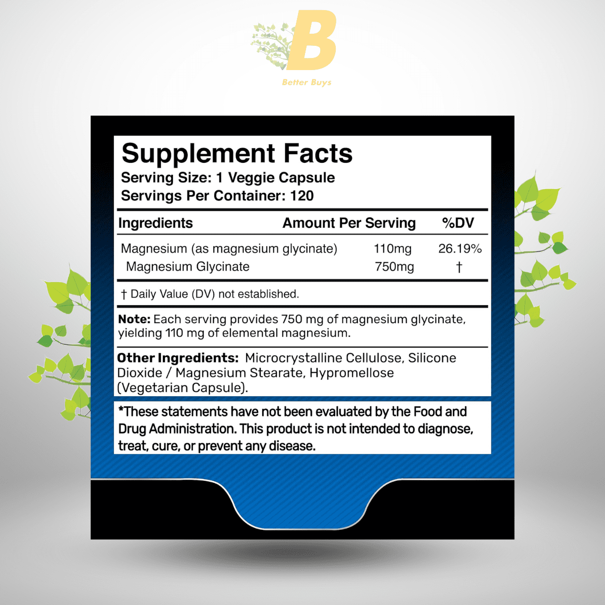 Magnesium Glycinate (750 mg): Chelated magnesium with glycine for high absorption, supporting sleep, stress relief, and heart health, delivering 179% DV.